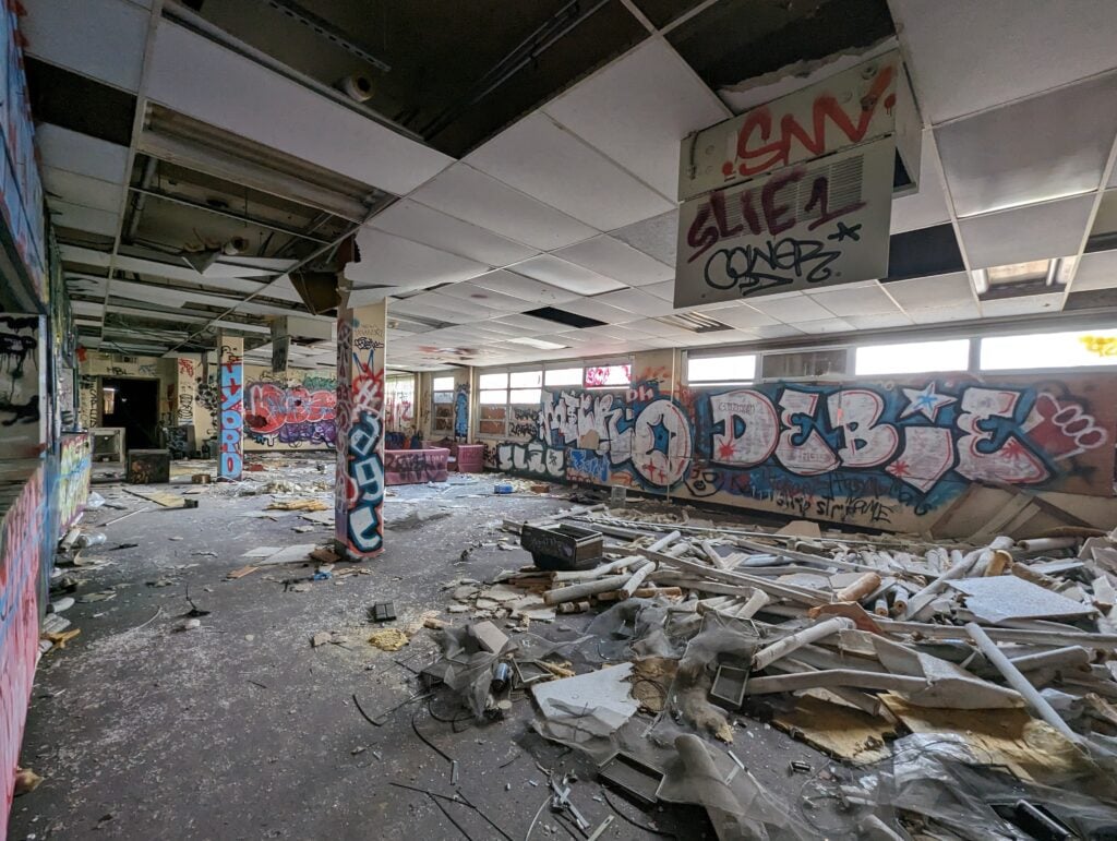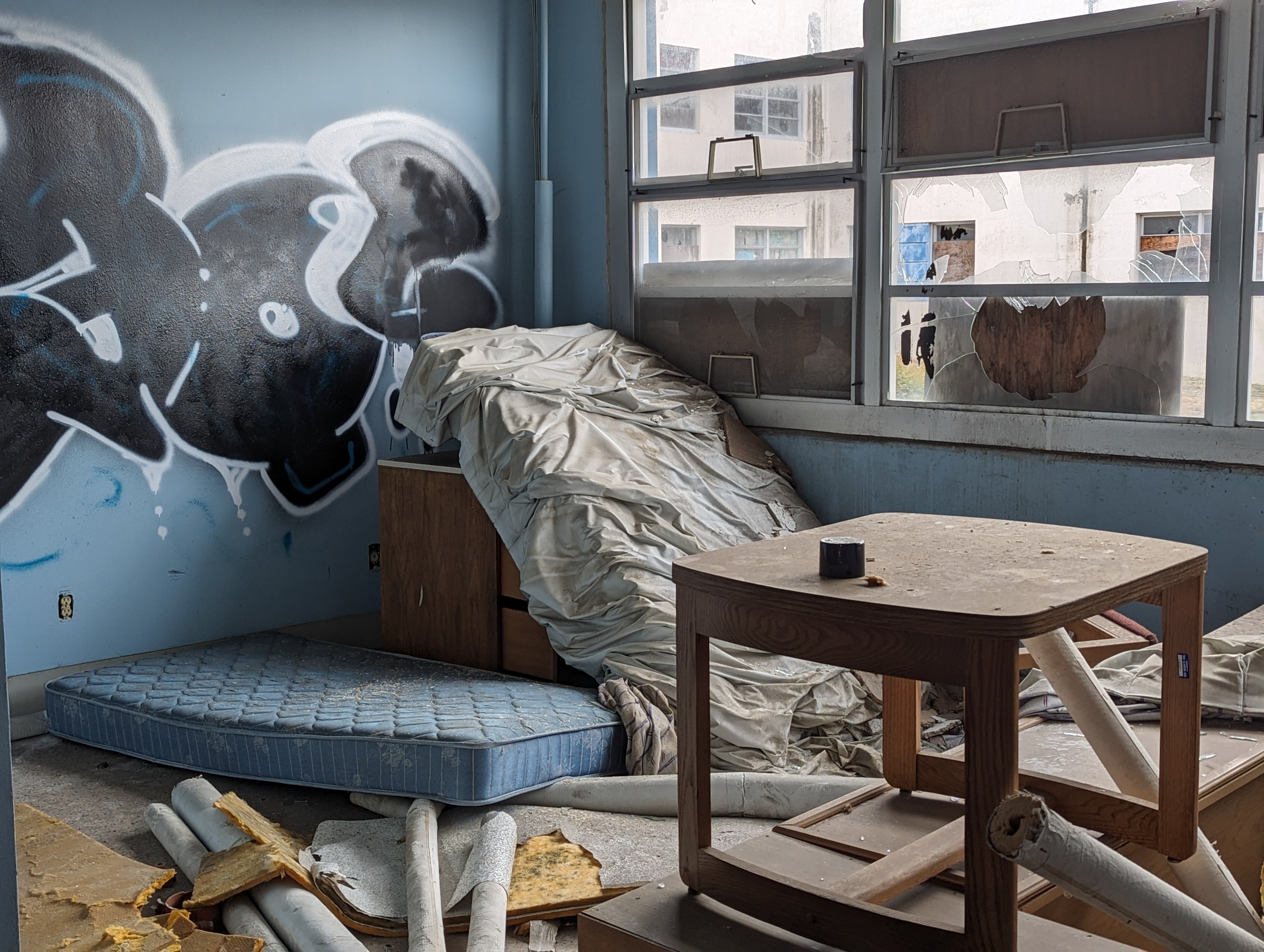Ex caserma militare. A volte una delle porte è aperta, ma c'è una recinzione che puoi aggirare e alcune finestre sbarrate potrebbero essere aperte con la forza.