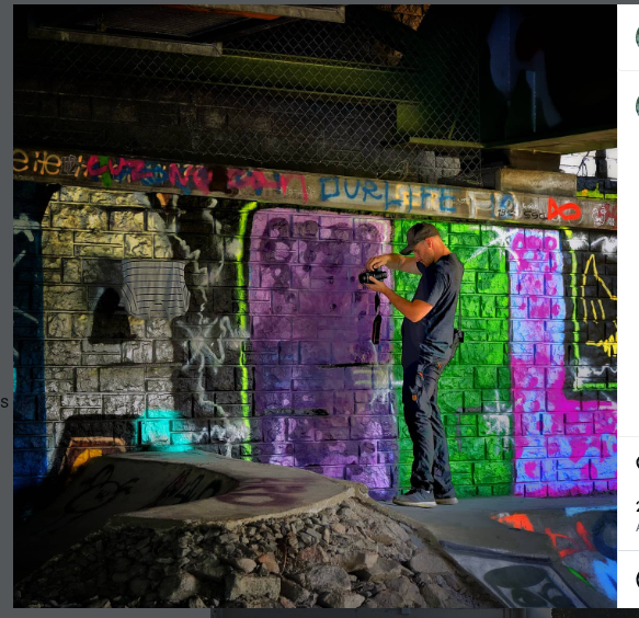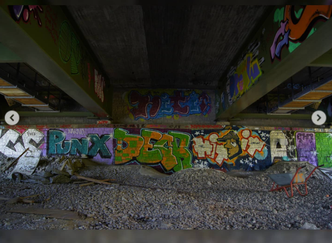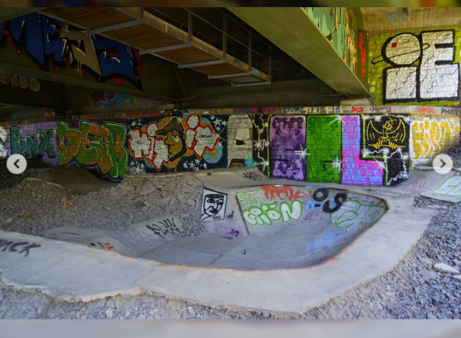 Un vecchio skatepark sotto un ponte dell'autostrada, Il posto sotto il ponte ha graffiti colorati su muri di mattoni e cemento e una piccola pista da skate in cemento circondata da ghiaia. Si tratta di un'area skate informale con un'atmosfera urbana e grezza, senza alcuna sicurezza formale.