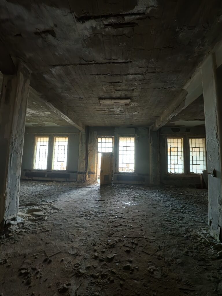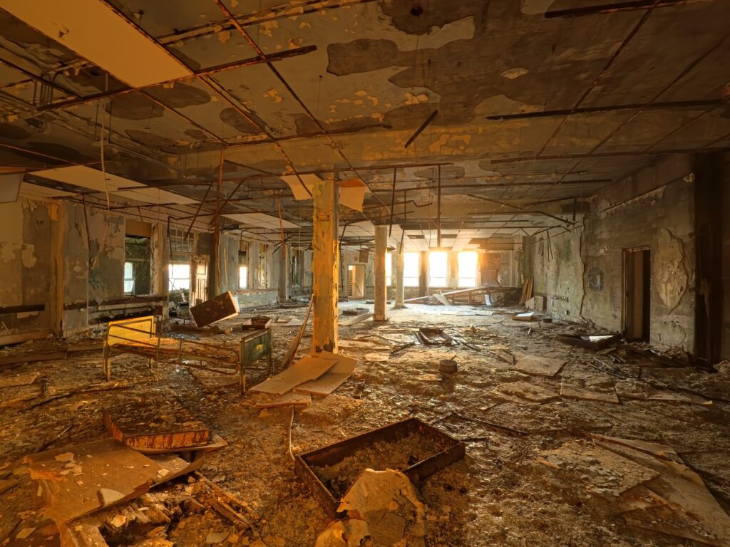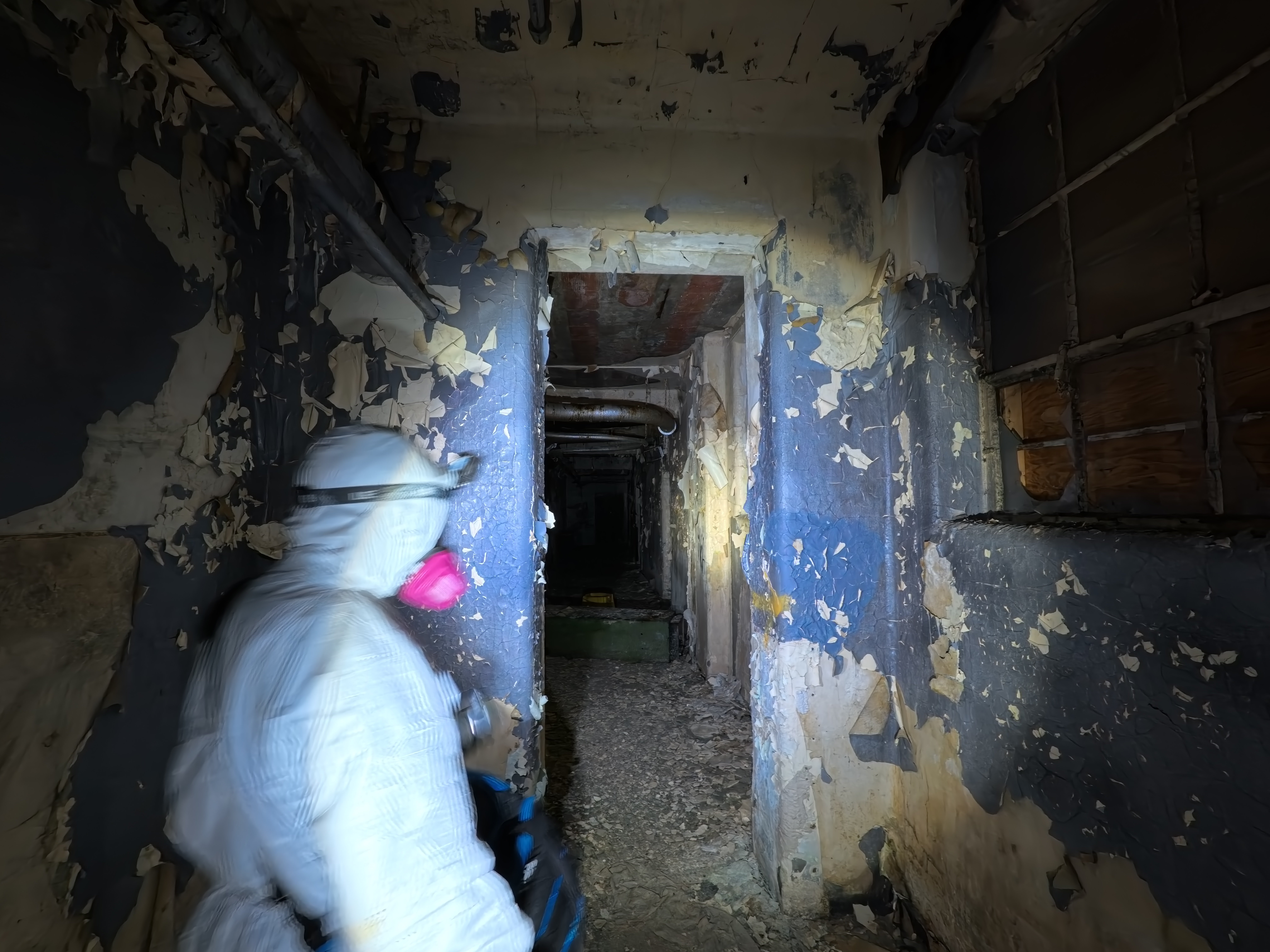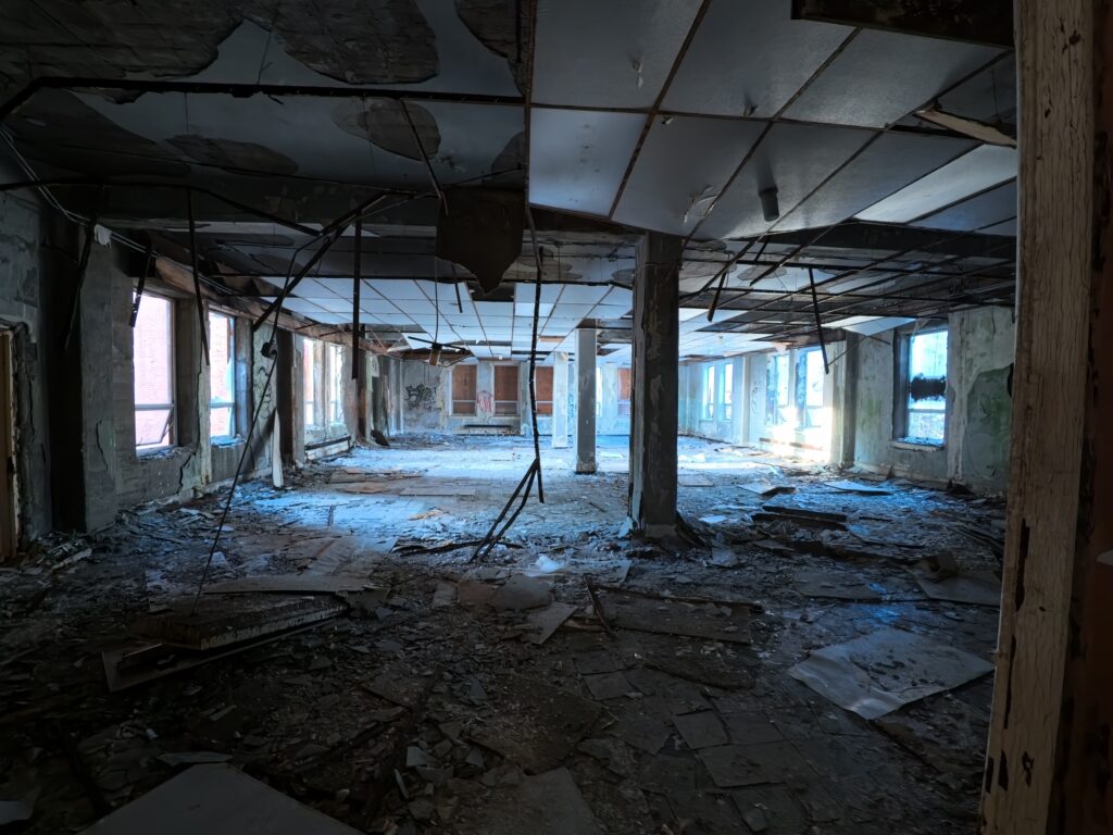 The interior is currently a high-risk environment containing significant amounts of friable asbestos, lead paint, and extensive black mold growth caused by decades of water damage. Because the building is structurally unsound and the air quality is toxic, it remains fenced off and heavily boarded.