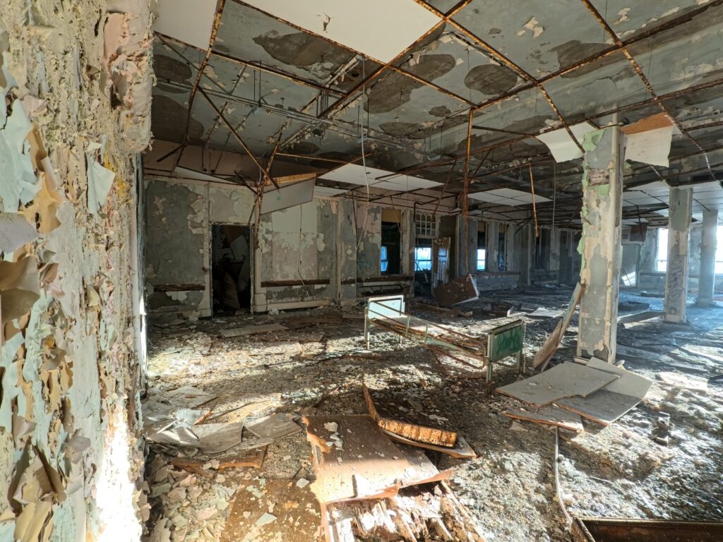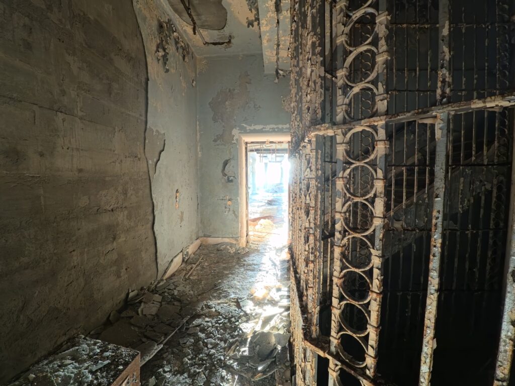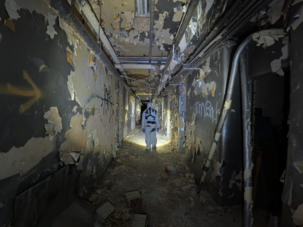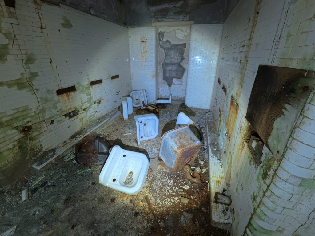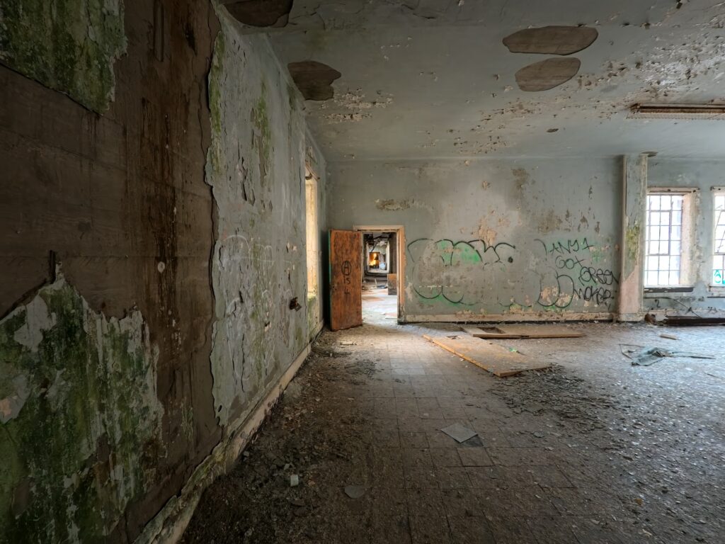 The interior is currently a high-risk environment containing significant amounts of friable asbestos, lead paint, and extensive black mold growth caused by decades of water damage. Because the building is structurally unsound and the air quality is toxic, it remains fenced off and heavily boarded.